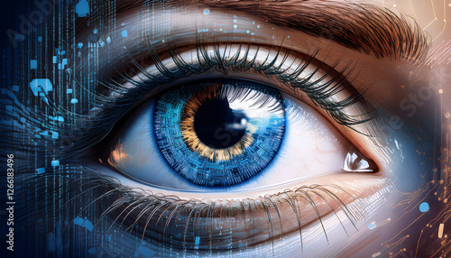 A striking blue eye with digital code and glowing technological patterns radiating outward symbolizes the fusion of human vision and artificial intelligence. Generative AI