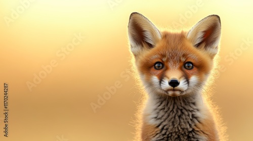 A striking close-up of a red fox pup with bright eyes and a fluffy coat, set against a warm golden background during sunset