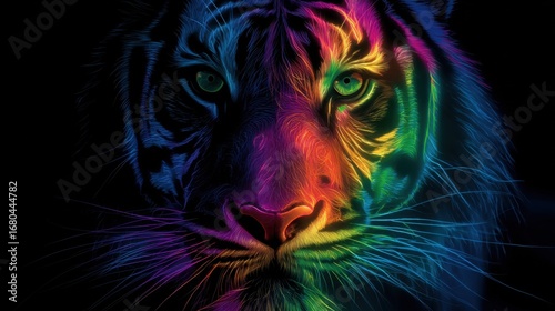 A striking close-up of a tiger's face featuring a mesmerizing display of colors including blue, green, and orange. The vivid patterns enhance the tiger's fierce and proud expression in darkness