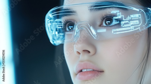 A striking close-up portrait of a woman with glowing digital data and holographic symbols reflecting in her sharp eyes.