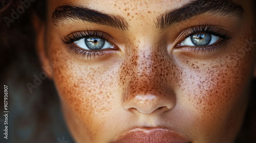 A striking close-up portrait of a woman with intense blue eyes and natural freckles, emphasizing her unique and captivating features.