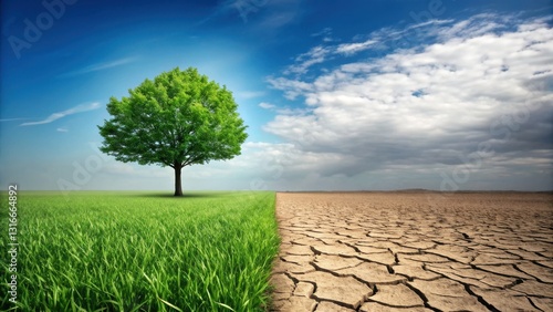A striking contrast between a lush green tree and vibrant grass on one side, and dry, cracked earth on the other, highlighting environmental issues.