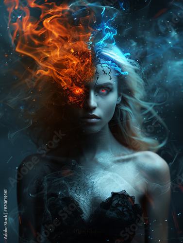 A striking digital portrait of a woman divided by fiery and icy elements, with glowing red eyes and a powerful, supernatural atmosphere