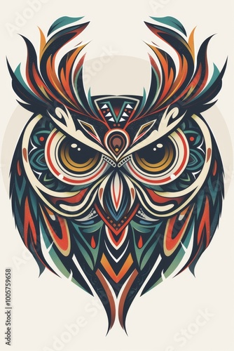 A striking geometric owl illustration featuring intricate patterns and bold colors, perfect for modern design projects and artistic decor.