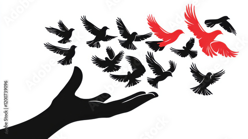 A striking graphic depiction of an open hand releasing doves, black and white silhouette style with red accents, crisp and clean cut-out design