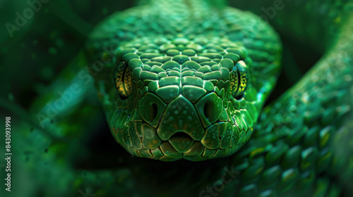 A striking green snake with venomous fangs peers curiously through mesmerizing eyes, its body fading into a soft blur.