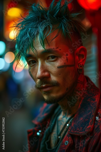 A striking image capturing the mysterious allure of a man with green hair and an array of piercings on his face.