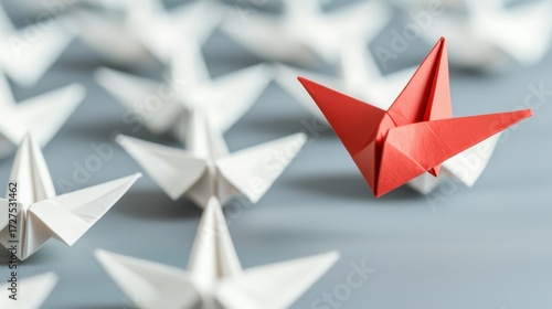 A striking image featuring a red origami crane standing out among a sea of white cranes, symbolizing individuality and uniqueness.