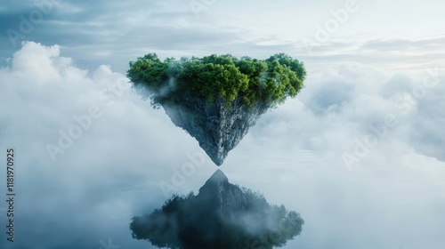 A striking image of a floating triangular island, lush with trees, hovering amid soft clouds, symbolizing the harmony between nature and imagination in a dreamlike setting.