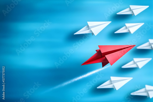 A striking image of a red paper airplane leading a pack of white airplanes, symbolizing innovation and leadership in business.