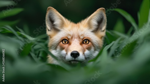 A striking image of a watchful fox surrounded by dense green grass, showcasing its natural beauty and alert demeanor, evoking themes of curiosity, nature, and wildlife observation.