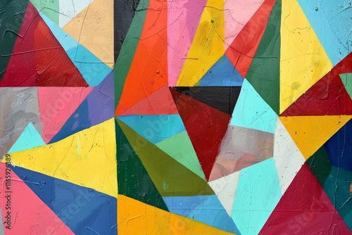 A striking mural showcases a series of vibrant triangles in various colors, creating an energetic visual display on a urban wall during the daytime.