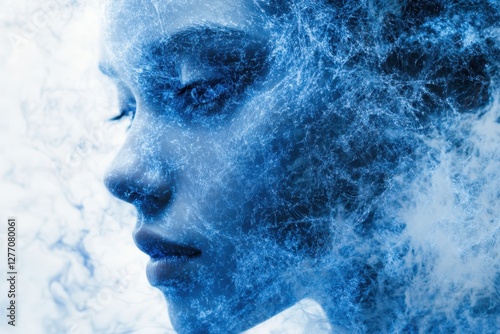 A striking portrait of a woman featuring vibrant blue hair set against a complementary blue background, creating a captivating visual contrast.