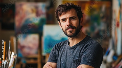 A striking portrait of a young male artist in his studio, surrounded by colorful paintings and artistic tools, showcasing his creativity and passion for art.
