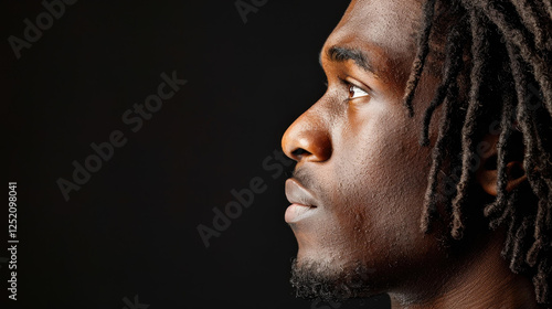 A striking portrait showcasing a young black mans profile against a rich black backdrop, highlighting his features beautifully.