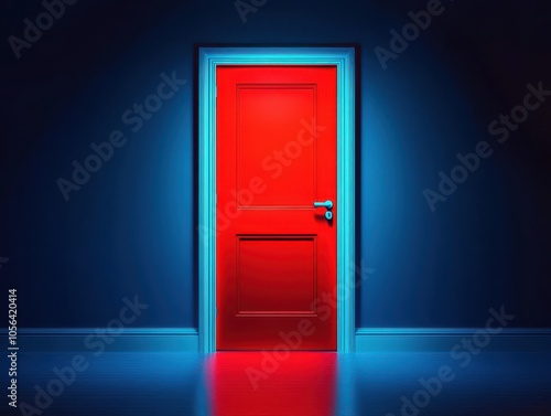 A striking red door illuminated by blue light, set against a dark backdrop, symbolizing mystery and opportunity.