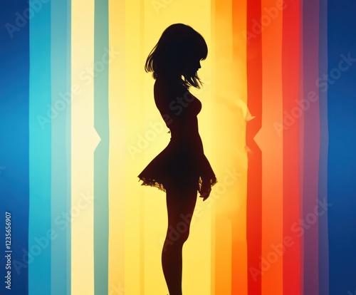 A striking silhouette of a female figure stands against vibrant colorful stripes, symbolizing empowerment and grace in the celebration of women everywhere