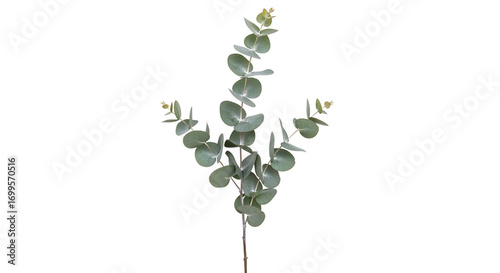 A striking single eucalyptus branch featuring distinctive silver-green leaves, perfect for botanical elements, natural decor, and aromatherapy uses