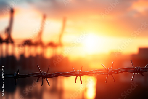 A striking sunset illuminated by cranes, framed by barbed wire, evoking themes of contrast and industrial beauty.