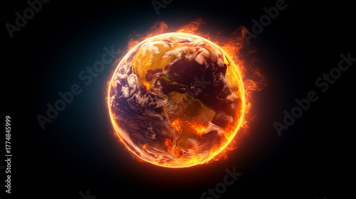 A striking view of Earth appears to be surrounded by flames, symbolizing the urgent issues of climate change and global warming. The image portrays the planet's delicate balance threatened