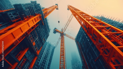 A striking view of towering construction cranes against a hazy skyline, emphasizing the scale and complexity of urban development.