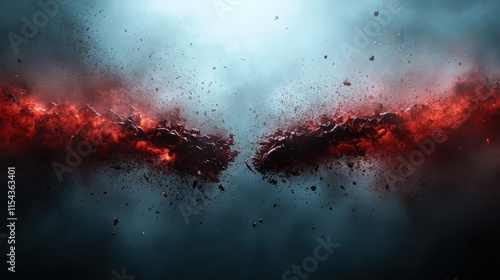A striking visual of red debris colliding energetically against a serene blue mist, encapsulating a dynamic clash of vibrant colors and energetic forces.