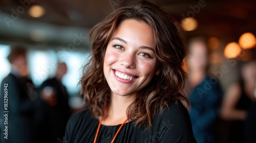 A striking young woman beams at the camera with a warm smile, set against a blurred background of social gathering, embodying confidence and approachability in a vibrant environment.