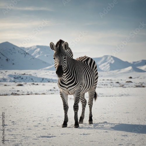 A striking zebra with a black and white striped pattern, standing in front of a bright white landscape.