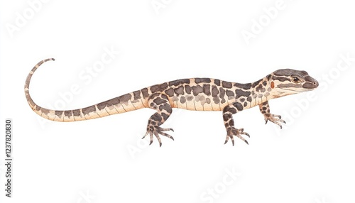 A strikingly patterned lizard in a dynamic pose against a white background, showcasing its unique features