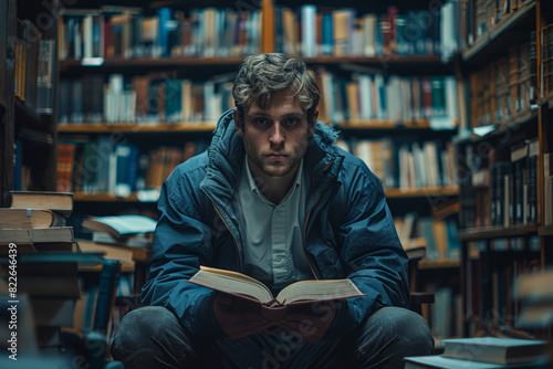 A student intensely studying in a library late at night. Concept of dedication and pursuit of knowledge. Generative Ai.