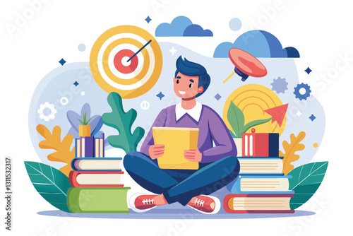 A student sits cross-legged, reading while surrounded by books, plants, and educational tools for achieving goals, Reading for achieve goals education success