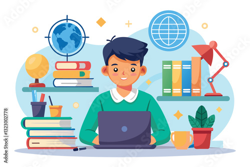 A student studies online using a laptop, surrounded by books, a globe, and a plant in a bright room, Student learning via laptop, e-learning