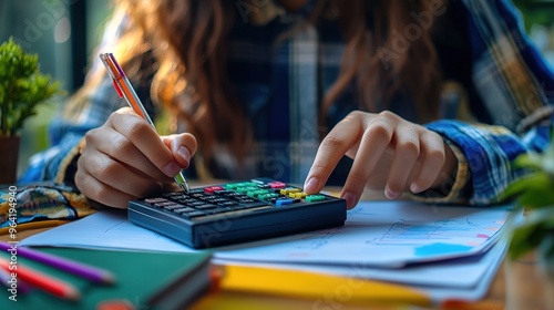 A student using a solar-powered calculator and other eco-friendly school supplies in class