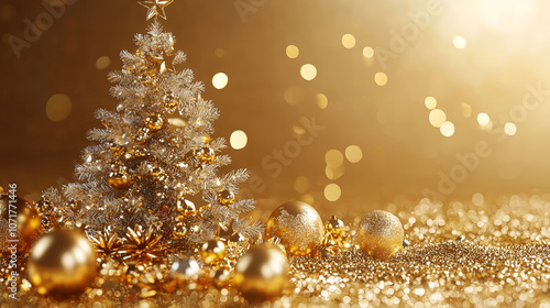 A stunning 3D graphic of a Christmas tree adorned with radiant gold ornaments, set against a rich gold background. Generative AI