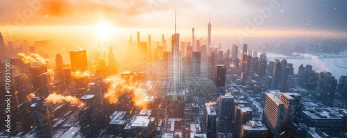 A stunning aerial view of a city skyline at sunset, showcasing towering buildings and vibrant colors.