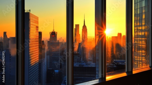A stunning aerial view of a city skyline captured from a window during a vibrant sunset, showcasing the silhouette of buildings against a colorful sky.