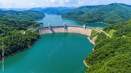 A stunning aerial view of a dam surrounded by lush mountains and a serene blue lake, showcasing the beauty of nature and human engineering.