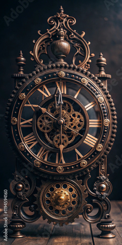 A stunning antique mechanical clock with intricate brass gears and Roman numerals, radiating vintage elegance and timeless craftsmanship.
