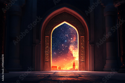 A stunning archway reveals a cosmic scene filled with stars and a vibrant sunset.