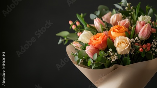 A stunning arrangement of roses and tulips, showcasing soft pastels and vibrant colors in a beautifully wrapped bouquet against a dark background.