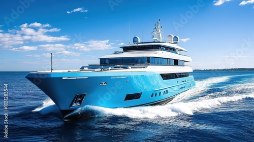 A stunning blue yacht gliding gracefully across the calm waters, its sleek design reflecting the clear blue sky. The boat’s elegant contours and vibrant blue color stand out against the serene,