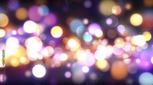 A stunning blurred view of a city skyline at night, featuring glowing bokeh lights in a variety of colors from buildings and streetlights. The soft focus creates a dreamy, atmosphe