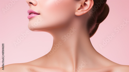 A stunning caucasian woman with flawless skin is shown with her neck and collarbones isolated on a pink studio background, representing natural beauty