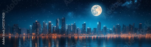 A stunning city skyline under a glowing full moon, surrounded by a starry sky, symbolizing beauty, calm, and urban serenity. Ideal for travel, cityscape, and night photography themes.