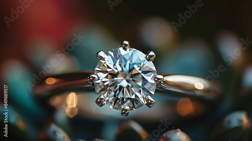 A stunning close-up of a diamond engagement ring, focusing on the radiant, round-cut diamond. The gold band gleams softly, surrounded by a blurred, colorful background, enhancing the ring's elegance