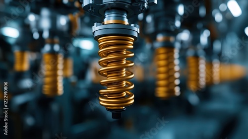 A stunning close-up of a gold automotive coil spring surrounded by a softly blurred industrial background, highlighting its intricate design and engineering.
