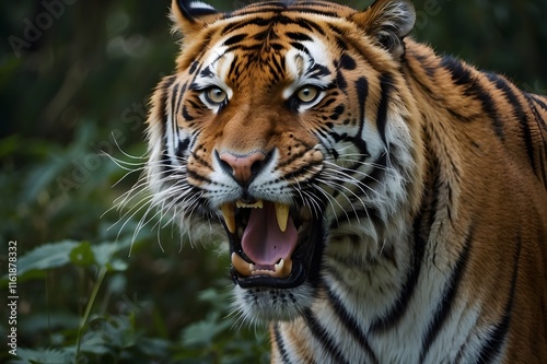 A stunning close-up of a tiger in the wild, showcasing the majestic creature s power and intensity. This captivating image illustrates the beauty and wonder of wildlife and conservation. See LessBy I
