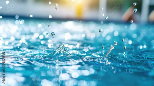 A stunning close-up of water droplets glistening on the surface of a swimming pool, showcasing intricate details and textures that enhance the beauty of this serene aquatic environment.