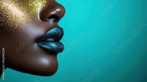 A stunning close-up profile of a model showcasing vibrant blue lips and golden glitter on the cheek, emphasizing beauty and artistic makeup techniques in vibrant colors.