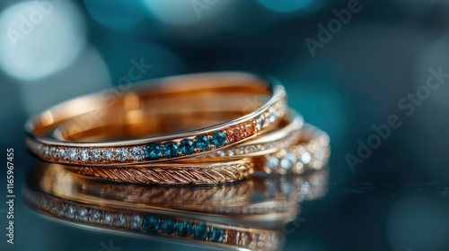 A stunning close-up shot of intricately designed gold rings adorned with sparkling gemstones, reflecting elegance and sophistication on a high-gloss surface.